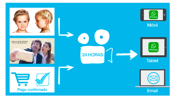Una vez recibidas las fotos del niño o la niña, la dedicatoria y se haya confirmado el pago se iniciará el proceso de producción de tu videocuento. En un plazo de no más de 24 horas (de lunes a viernes) nos pondremos en contacto contigo para que nos indiques cómo deseas recibir el videocuento: en tu terminal móvil, a través del whatsapp o en tu correo electrónico. Una vez recibido, podrás compartirlo en redes sociales, grupos y contactos de whatsapp, internet, tablets, etc...
